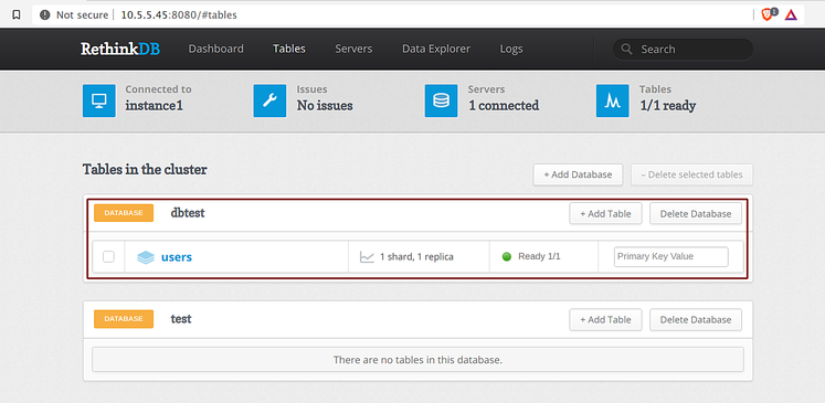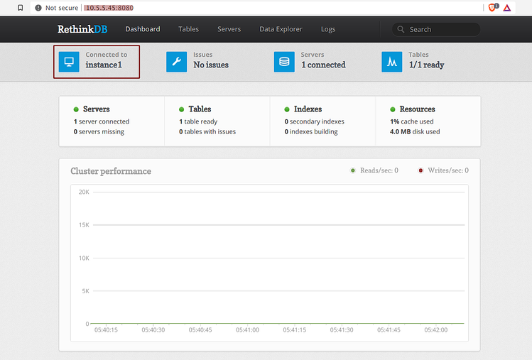 Jetzt siehst du das RethinkDB-Dashboard wie unten abgebildet.
