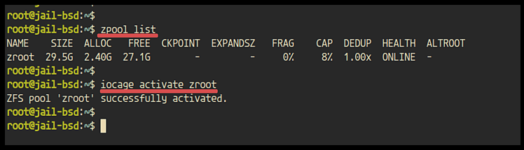 Aktiviere den „zroot“-Pool für die Verwendung von Iocage mit dem unten stehenden Befehl.