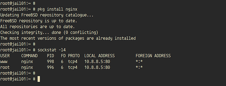 In diesem Schritt werden wir die „jail01“ testen, indem wir den Nginx-Webserver darauf installieren und dann versuchen, von außerhalb des Netzwerks auf Nginx zuzugreifen, wobei die Verbindung zur „jail01“ umgeleitet wird.