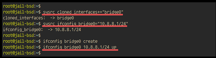 sysrc cloned_interfaces+="bridge0" sysrc ifconfig_bridge0="10.8.8.1/24"