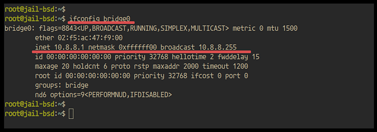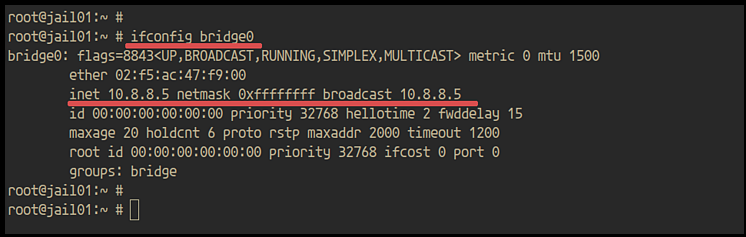 Du wirst feststellen, dass die Schnittstelle „bridge0“ die konfigurierte IP-Adresse „10.8.8.5“ hat.