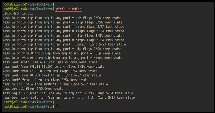 Überprüfe danach alle Regeln der Pf-Firewall mit dem folgenden Befehl.