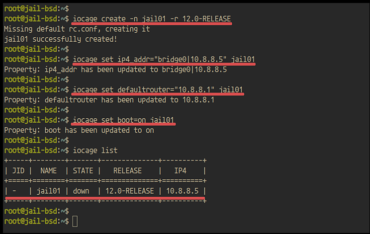 iocage set ip4_addr="bridge0|10.8.8.5" jail01 iocage set defaultrouter="10.8.8.1" jail01