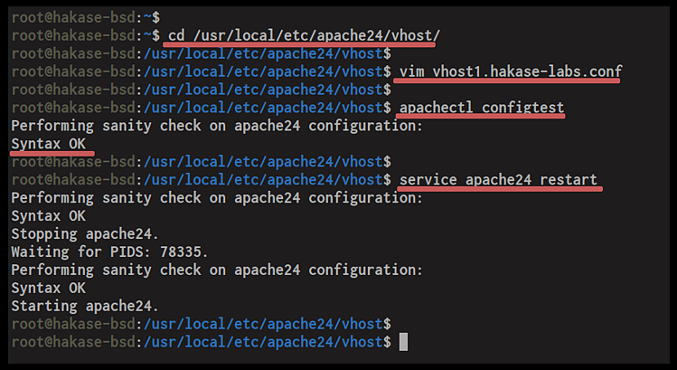 Als Nächstes gehst du in das Verzeichnis „/usr/local/etc/apache24/vhost/“ und erstellst die Datei für den virtuellen Host mit dem Namen „vhost1.hakase-labs.conf“.