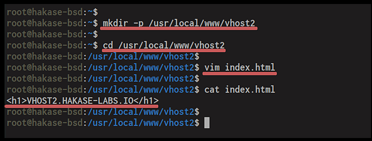 Danach erstellst du ein neues Web-Root-Verzeichnis „/usr/local/www/vhost2“ für die zweite virtuelle Host-Domain „vhost2.hakase-labs.io“ und gehst dort hinein.