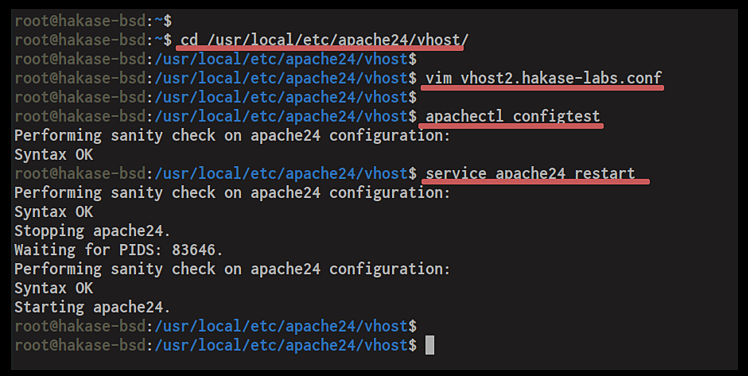 Als Nächstes gehst du in das Verzeichnis „/usr/local/etc/apache24/vhost/“ und erstellst eine neue Konfiguration für den virtuellen Host „vhost2.hakase-labs.conf“.