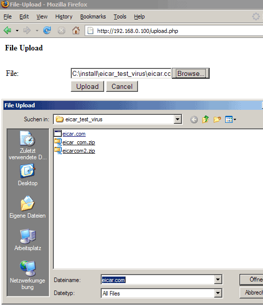 Nun müssen wir einen Virus bekommen um es zu testen. Glücklicherweise gibt es einen Eicar Testvirus, eine Datei, die keinen Schaden anrichtet, aber dessen Signatur von allen Virenscannern erkannt wird, damit Du testen kannst, ob Dein Virenscanner funktioniert. Gehe zu http://www.eicar.org/anti_virus_test_file.htm und lade die Dateien eicar.com, eicar_com.zip, und the eicarcom2.zip files auf Deine Festplatte. Teste dann das Hochladen mit jeder von ihnen: