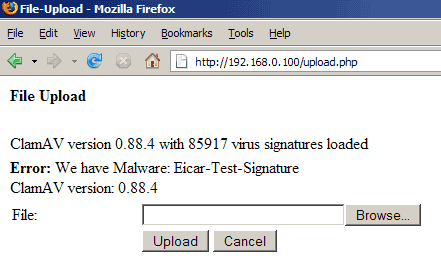 Wenn alles klappt, sollte php-clamavlib den Virus erkennen und sich weigern ihn hochzuladen: