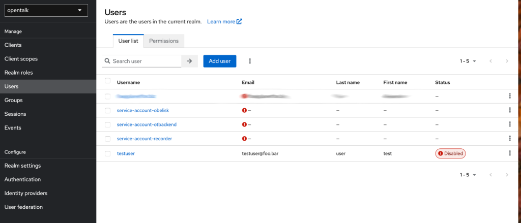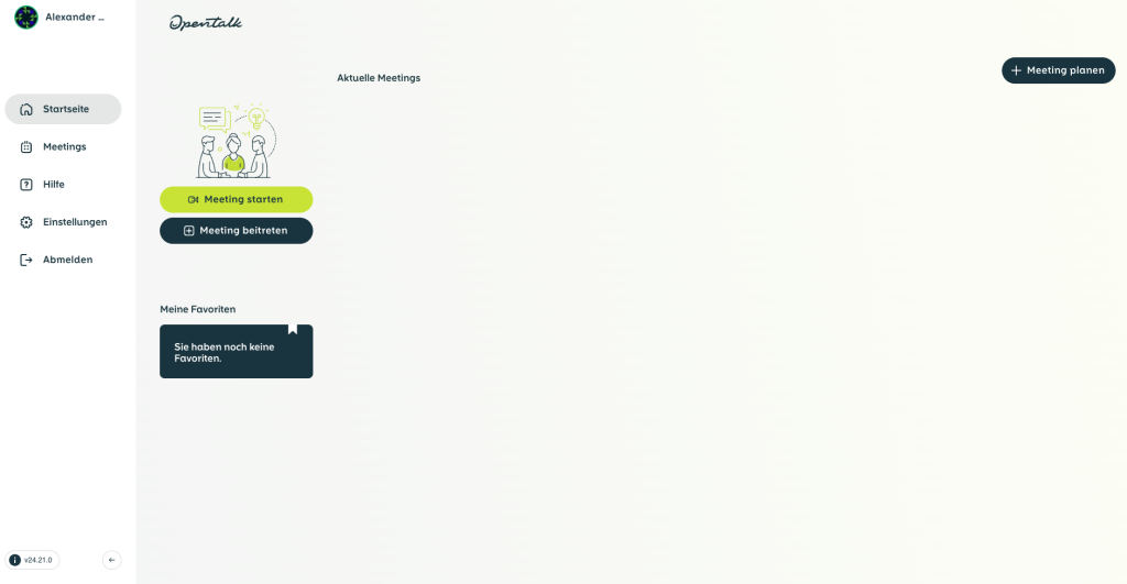 Dann links oben opentalk auswählen, ihr könnt entweder den testuser temporär aktivieren oder einen neuen erzeugen